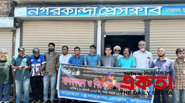 বিলায়েত হোসেন লিটন, বিশেষ প্রতিনিধিঃ ফরিদপুরের নগরকান্দায় গাজীপুরে দৈনিক ‘প্রতিদিনের কাগজ’ পত্রিকার সাংবাদিক আসাদুজ্জামান তুহিন কে নির্মম ভাবে কুপিয়ে ও জবাই করে হত্যার প্রতিবাদে এবং সারাদেশে সাংবাদিকদের নিরাপত্তা সুরক্ষিত। সাংবাদিকদের