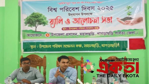 ছানোয়ার হোসেন, মহালছড়ি(খাগড়াছড়ি) প্রতিনিধিঃ “প্লাষ্টিক দুষণ আর নয়, বন্ধ করার এখনি সময়,, এই প্রতিপাদ্যে খাগড়াছড়ির মহালছড়িতে উদযাপিত হলো বিশ্ব পরিবেশ দিবস ২০২৫। উপজেলা প্রশাসনের আয়োজনে এক বর্ণাঢ্য র্যালি ও আলোচনা