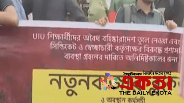 একতা ডেস্কঃ সড়ক অবরোধ করেছেন ইউনাইটেড ইন্টারন্যাশনাল ইউনিভার্সিটির (ইউআইইউ) শিক্ষার্থীরা ঢাকার নতুনবাজার এলাকায়। অবৈধ বহিষ্কারাদেশ প্রত্যাহার, দমনমূলক সিন্ডিকেটের জবাবদিহি এবং শিক্ষাঙ্গনে গণতান্ত্রিক পরিবেশ নিশ্চিত করার দাবিতে শনিবার সকাল থেকে এই