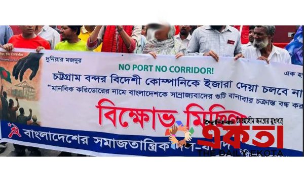একতা ডেস্কঃ চট্টগ্রাম বন্দর বিদেশী কোম্পানিকে ইজারা দেয়ার পরিকল্পনা বাতিল ও মানবিক করিডোরের নামে বাংলাদেশকে সাম্রাজ্যবাদের গুটি বানাবার চক্রান্ত বন্ধের দাবিতে বাসদের বিক্ষোভ সমাবেশ ও মিছিল অনুষ্ঠিত হয়েছে। শুক্রবার সকালে