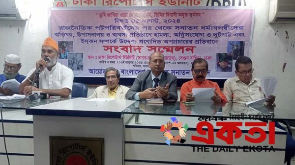 একতা ডেস্ক: অন্তর্বর্তীকালীন সরকারের কাছে হিন্দু সম্প্রদায়ের (সনাতনী) দেওয়া আট দফা দাবি বাস্তবায়ন না হলে প্রয়োজনে বৃহত্তর আন্দোলনে যাওয়ার ঘোষণা দিয়েছে বাংলাদেশ সম্মিলিত সনাতন পরিষদ। শনিবার ঢাকা রিপোর্টার্স ইউনিটিতে বাংলাদেশ