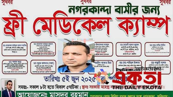 বিলায়েত হোসেন লিটন, বিশেষ প্রতিনিধিঃ ফরিদপুরের নগরকান্দায় বিশিষ্ট সমাজ সেবক ইংল্যান্ড প্রবাসী মাসুদুর রহমানের সার্বিক তত্ত্বাবধানে এবং বেগম শিরিয়া সমাজ কল্যাণ সংস্থার উদ্যোগে ফ্রী মেডিকেল ক্যাম্প অনুষ্ঠিত হয়েছে। বৃহস্পতিবার সকাল