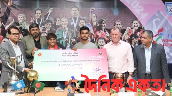 একতা ডেস্কঃ বাংলাদেশের ফুটবল ফেডারেশনের (বাফুফে) সম্মেলনকক্ষে যুব ও ক্রীড়া মন্ত্রণালয়ের পক্ষ থেকে সাফজয়ী নারী ফুটবল দলের অভূতপূর্ব বিজয়ের জন্য পুরস্কার হিসেবে এক কোটি টাকা প্রদান করা হয়েছে এবং বিসিবি