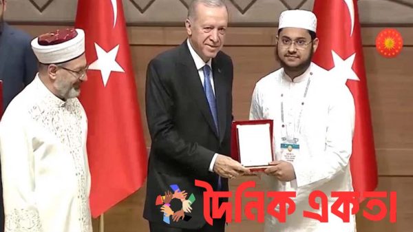 একতা ডেস্ক: তুরস্কে অনুষ্ঠিত নবম আন্তর্জাতিক হিফজুল কোরআন প্রতিযোগিতায় প্রথম স্থান অধিকার করেছেন বাংলাদেশের হাফেজ মুয়াজ মাহমুদ। তুরস্কের প্রেসিডেন্ট রিসেপ তাইয়েপ এরদোয়ানের হাত থেকে মুয়াজ মাহমুদ সম্মাননা ক্রেস্ট ও পুরস্কার