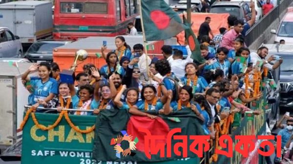 একতা ডেস্ক: সাফ রেফারির শেষ বাঁশি বাজার সঙ্গে সঙ্গে টানা দ্বিতীয়বার সাফ চ্যাম্পিয়ন হওয়ায় উল্লাসে ফেটে পড়েন বাংলার বাঘিনীর দল। পুরস্কার বিতরণী পর্ব গুরুর জন্য তখন সবার অপেক্ষা। এ সময়